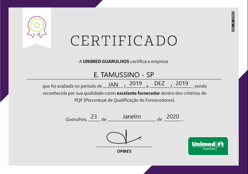 O intenso trabalho da E. Tamussino na busca pela melhoria contínua no atendimento aos clientes acaba de ser reconhecido pela Unimed. A nossa empresa foi certificada pela Equipe de Compras e OPMED do Sistema Unimed e alcançou a categoria "Excelente", que é a classificação máxima da certificação.