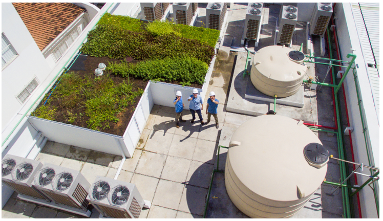Outra maneira de reduzir o consumo no dia a dia é por meio da captação própria de água da chuva, o que ocasiona uma economia em torno de 50%. O sistema é utilizado para irrigação do telhado verde e para uso nas descargas de todos os banheiros. Já o telhado verde exerce a função de reduzir o aquecimento da cobertura, o que incide em menos uso do sistema de ar-condicionado e contribui para diminuir a poluição do ar.